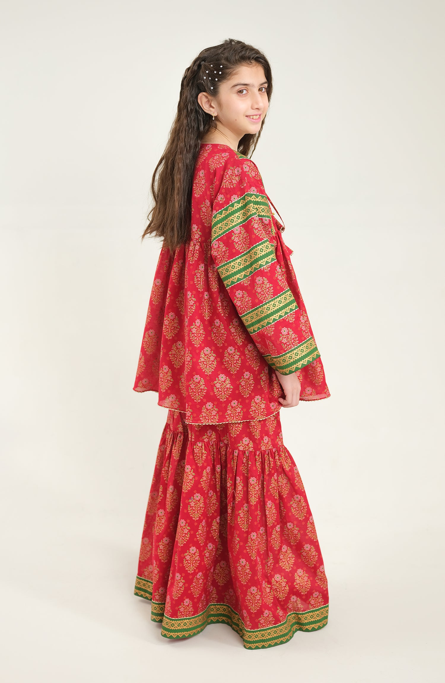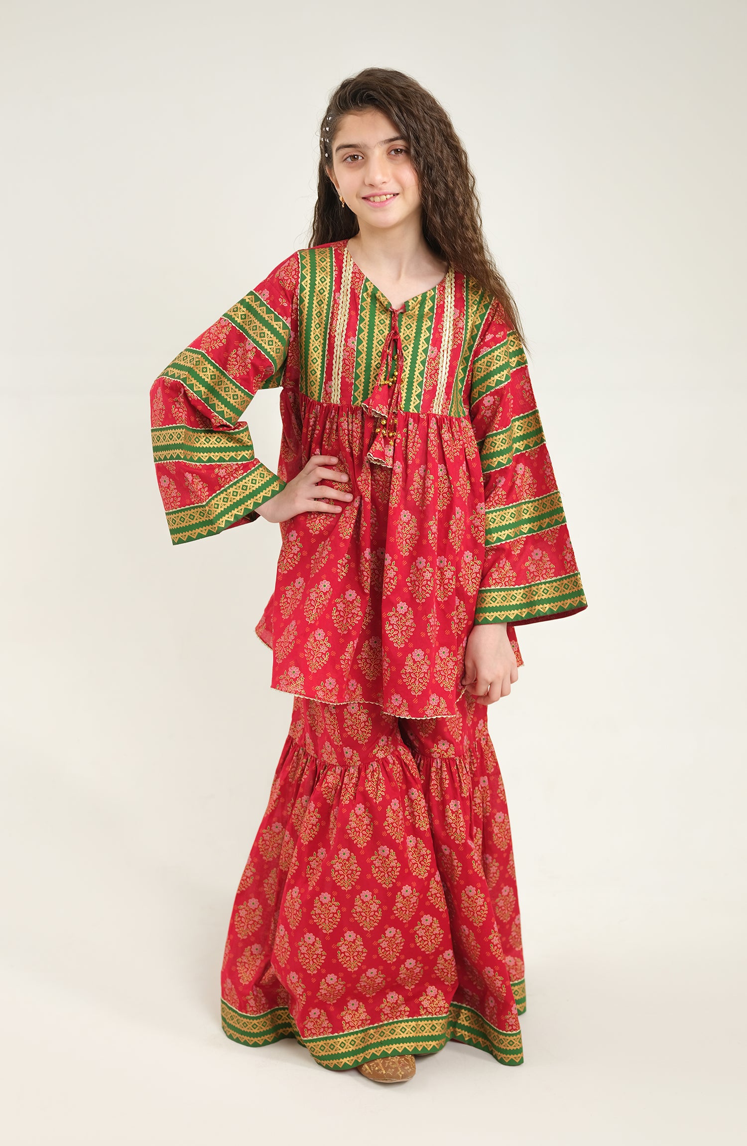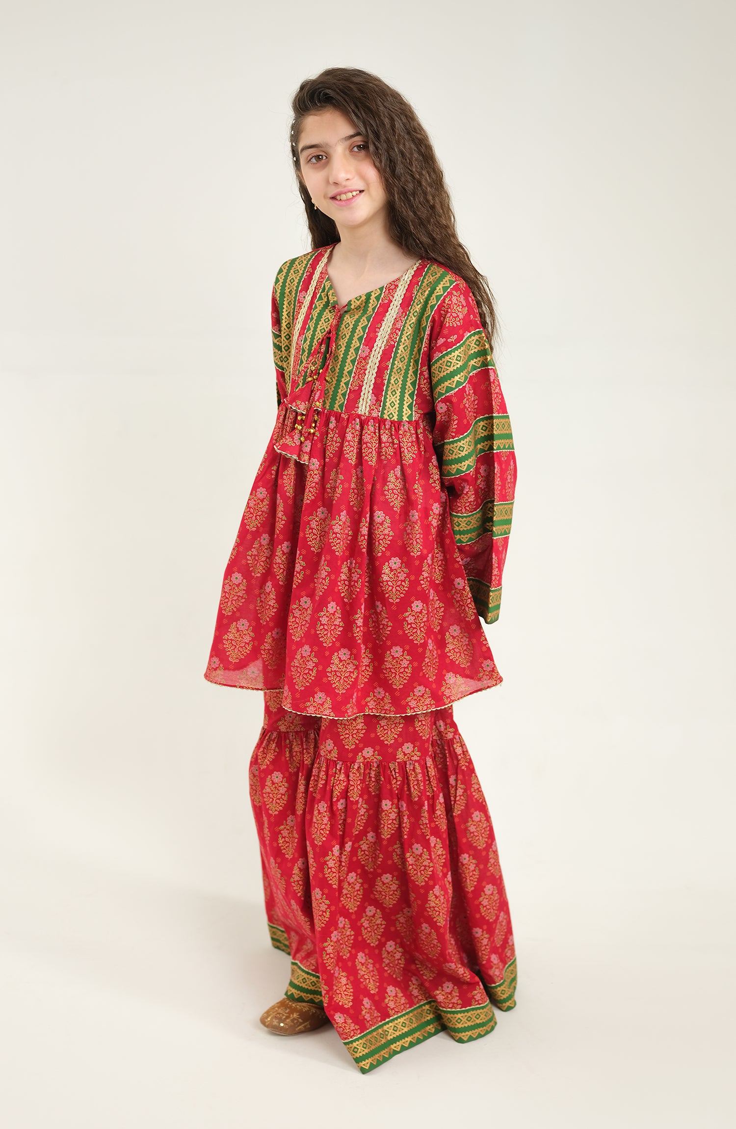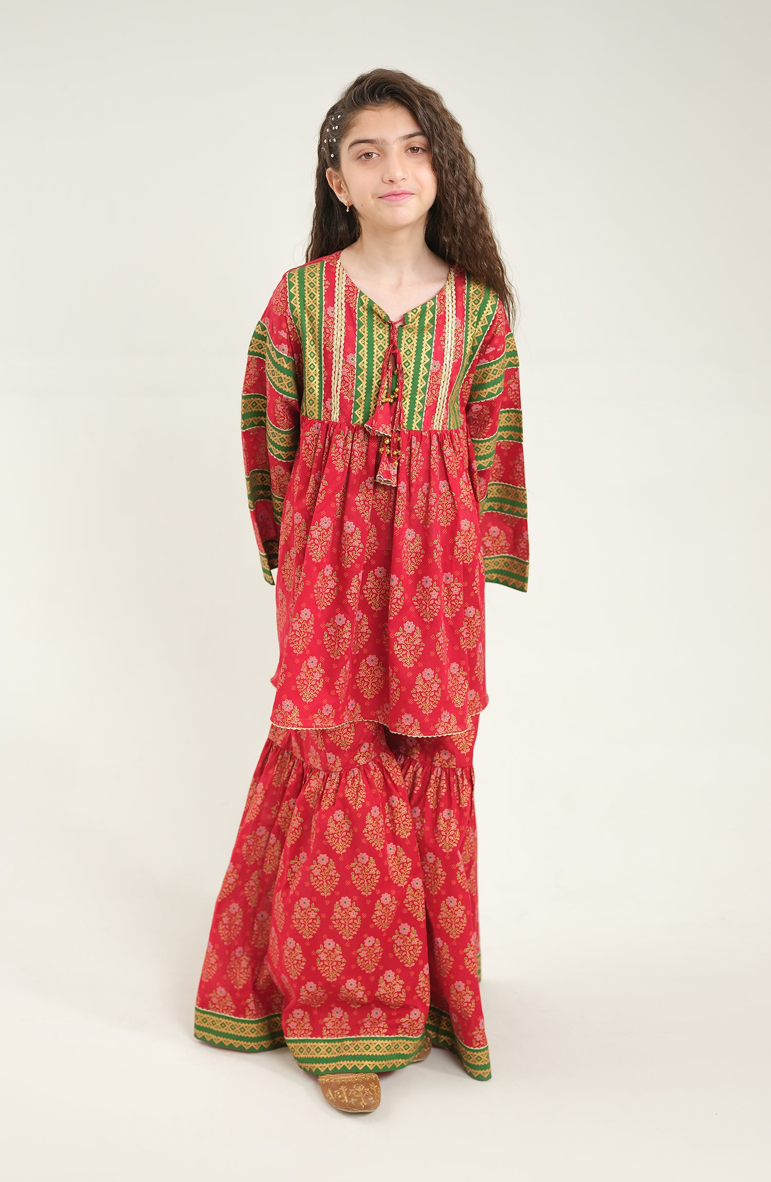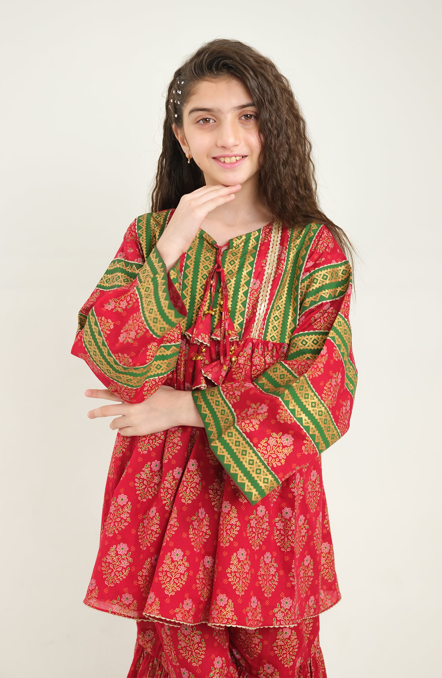 A radiant red woven cotton lawn suit, designed for kids with a touch of elegance and comfort, perfect for festive and special occasions.