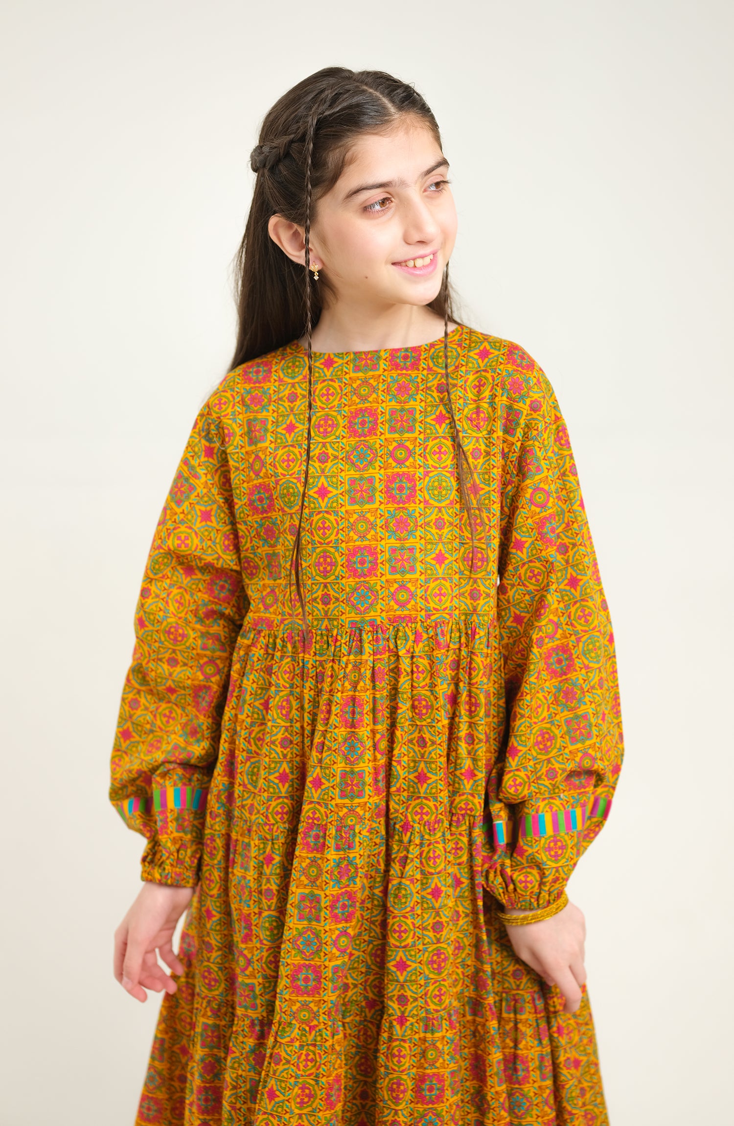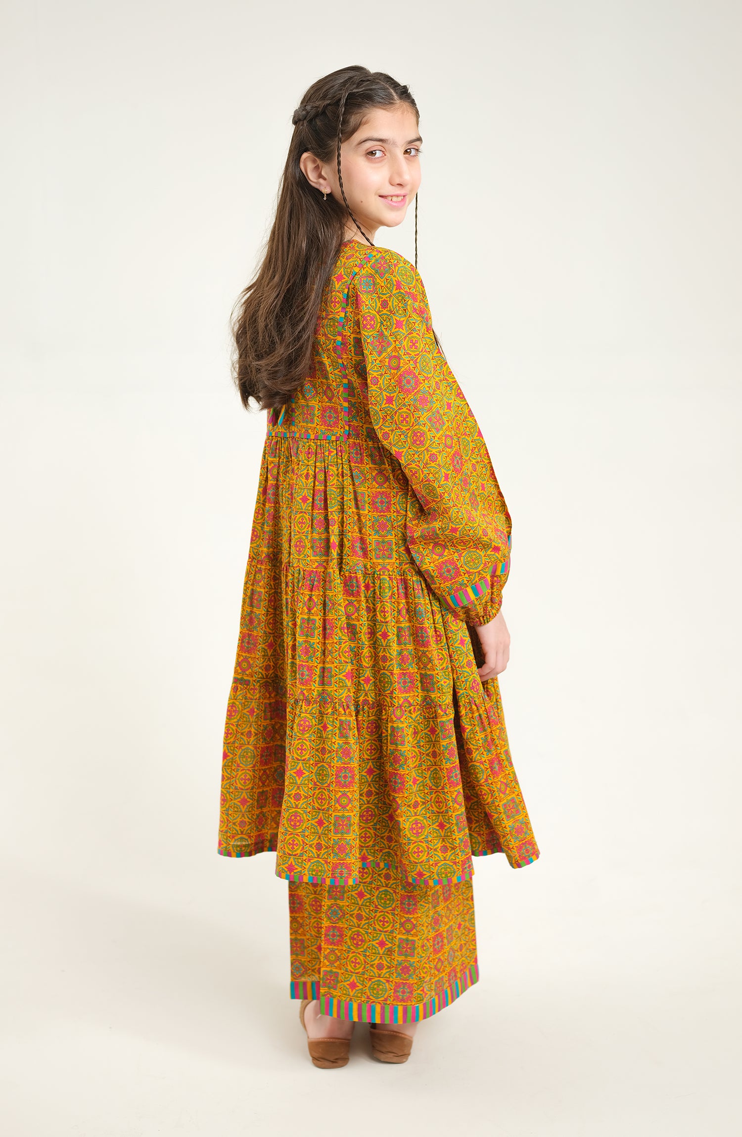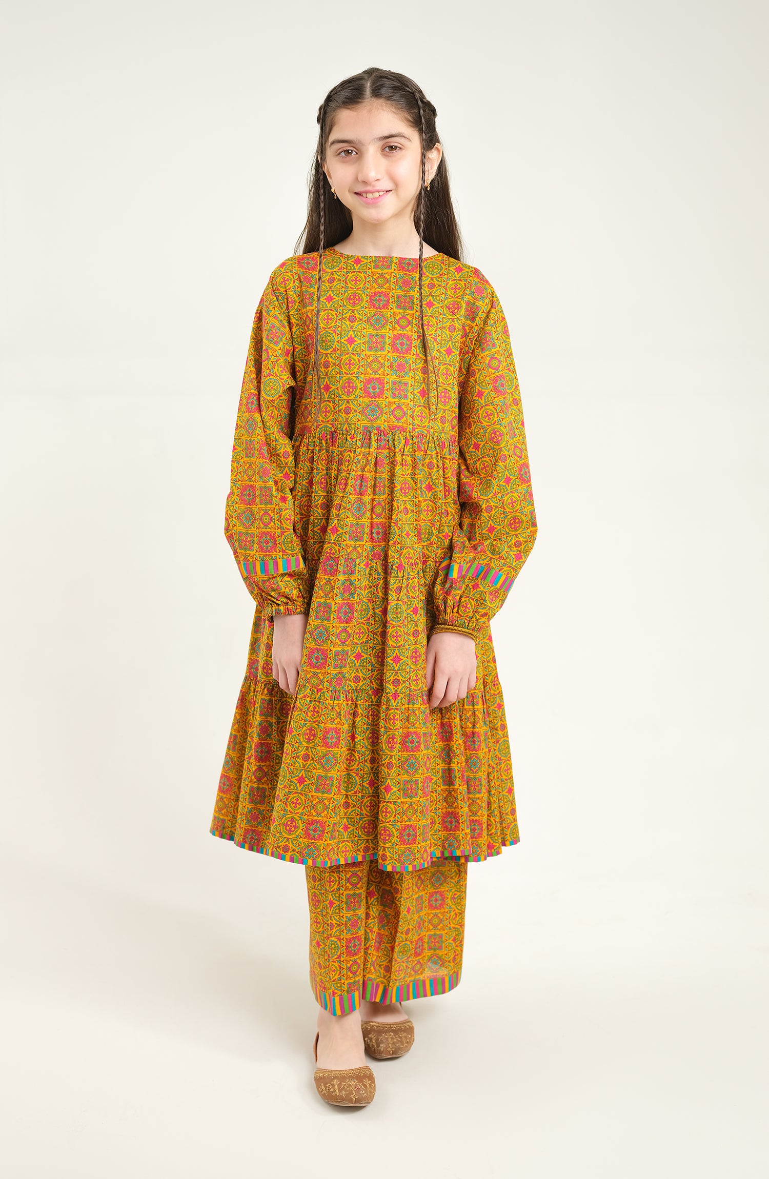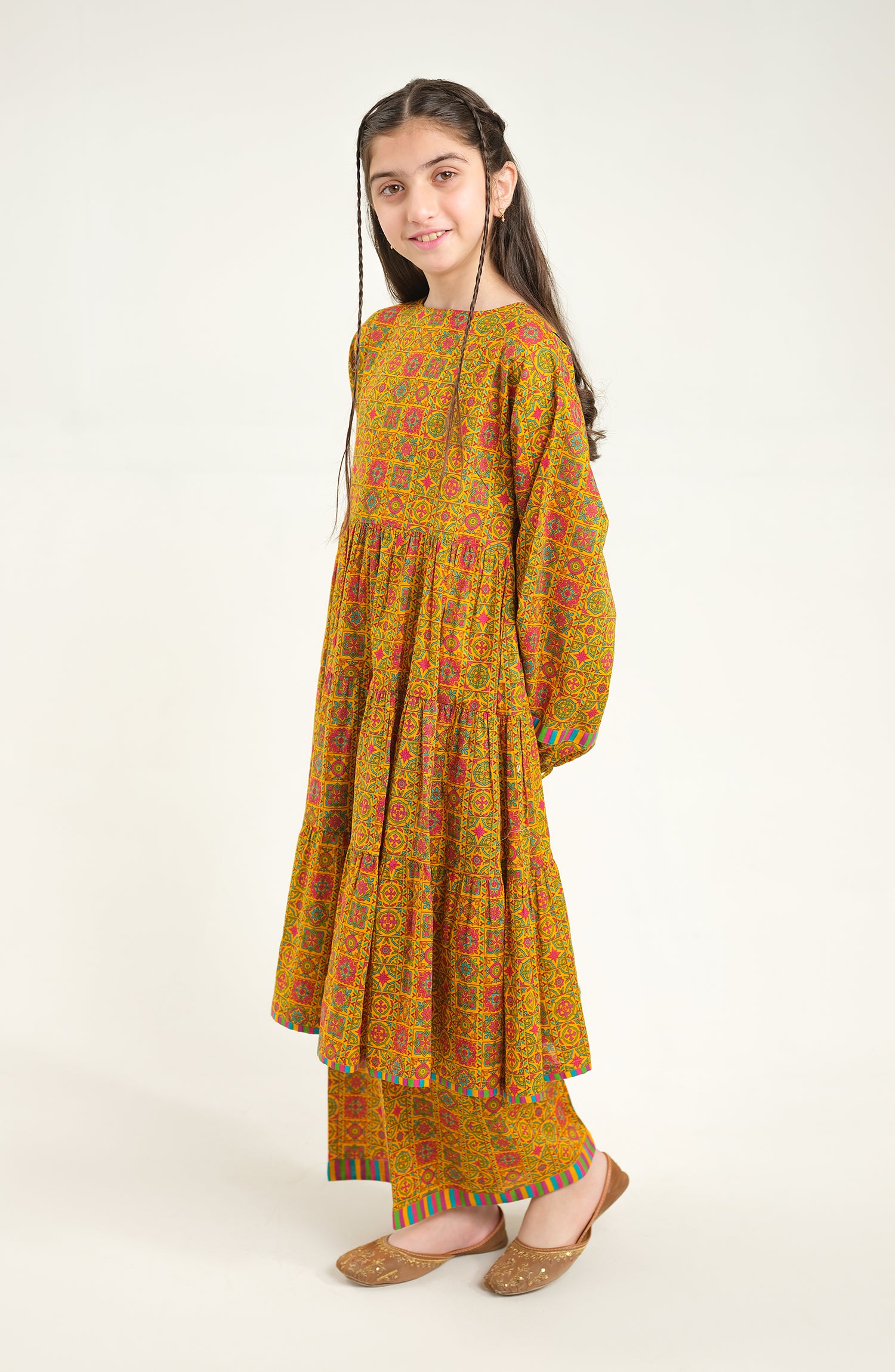 A vibrant yellow woven cotton lawn suit, designed for kids' party wear with a perfect blend of comfort and elegance.