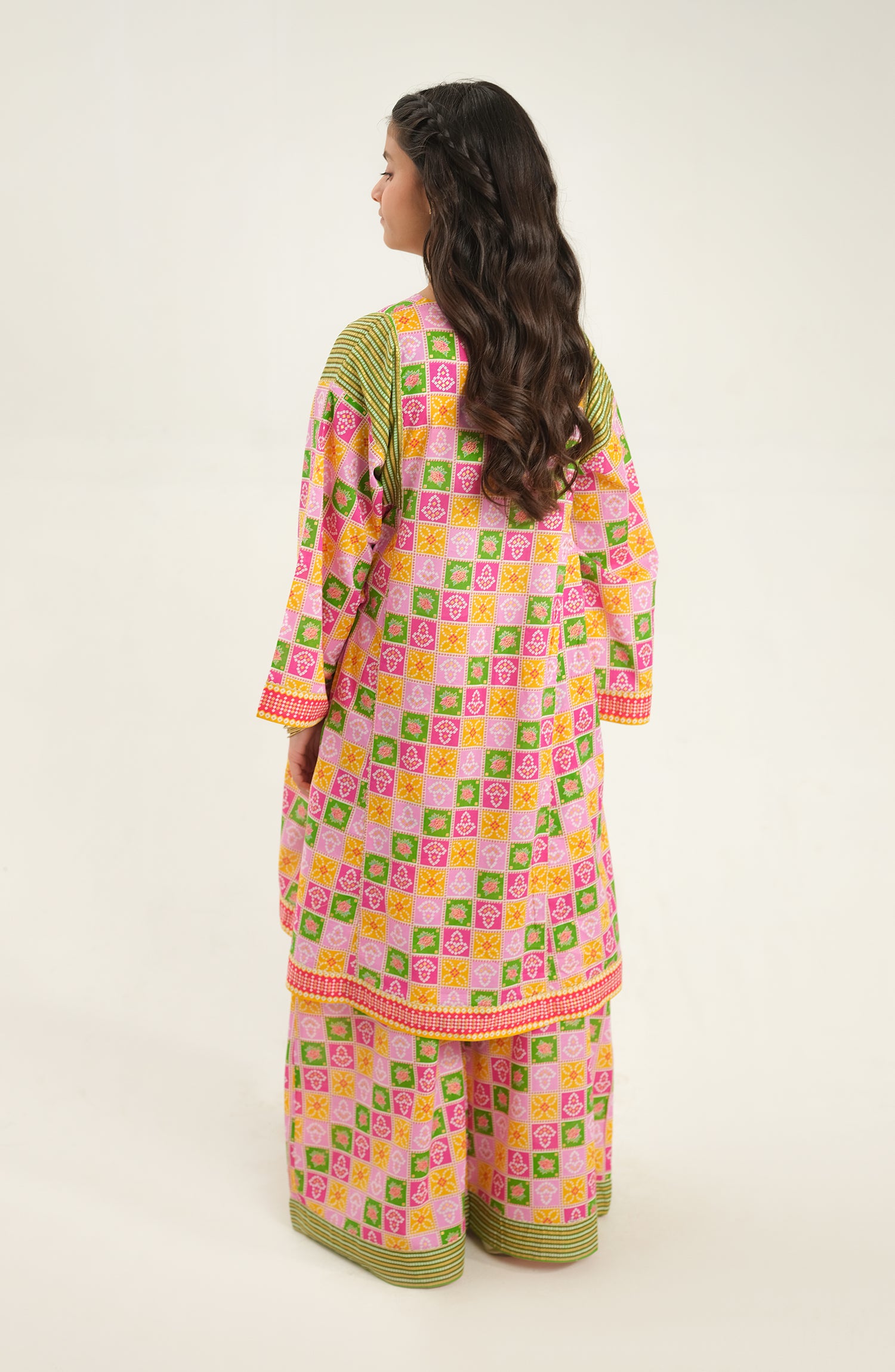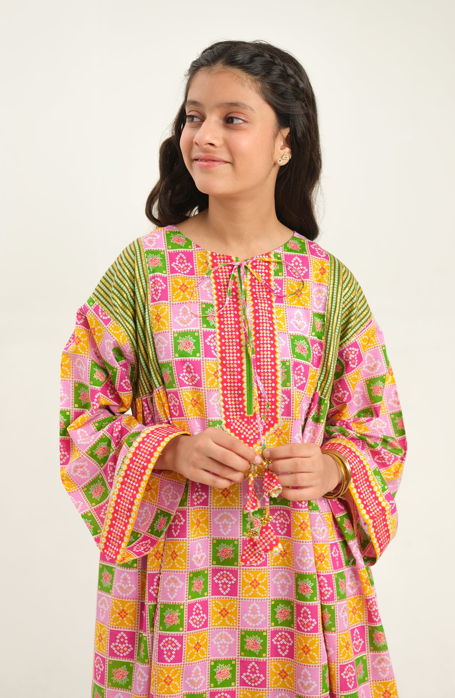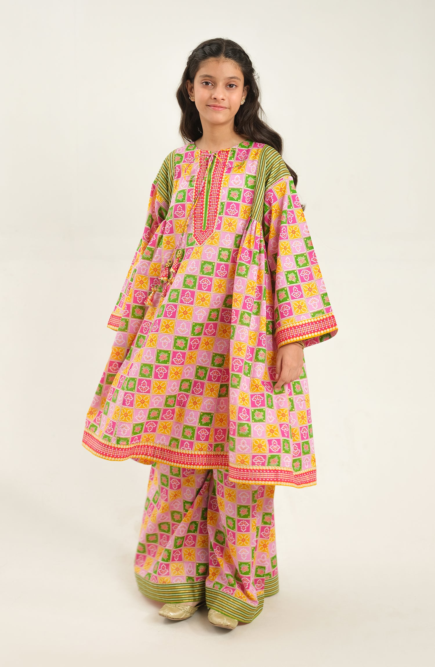 A vibrant multi-colored woven cotton lawn suit designed for kids, offering a playful yet elegant look for special occasions.