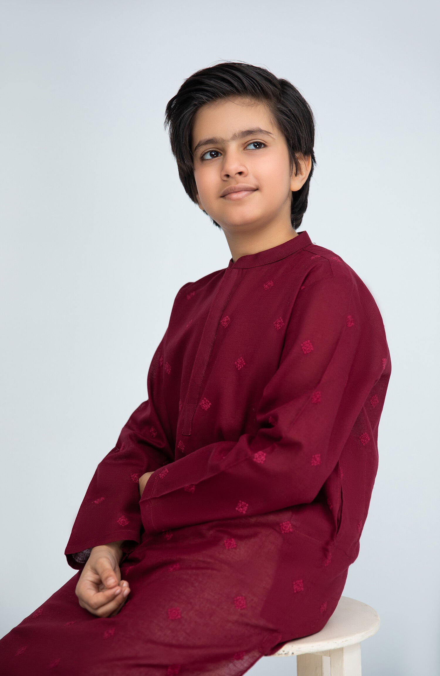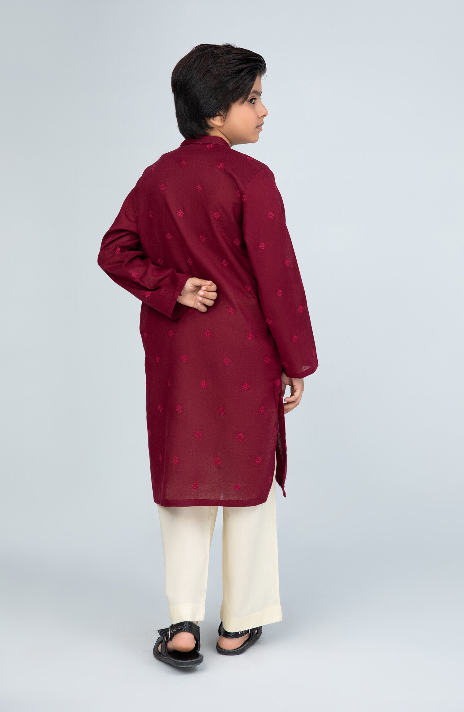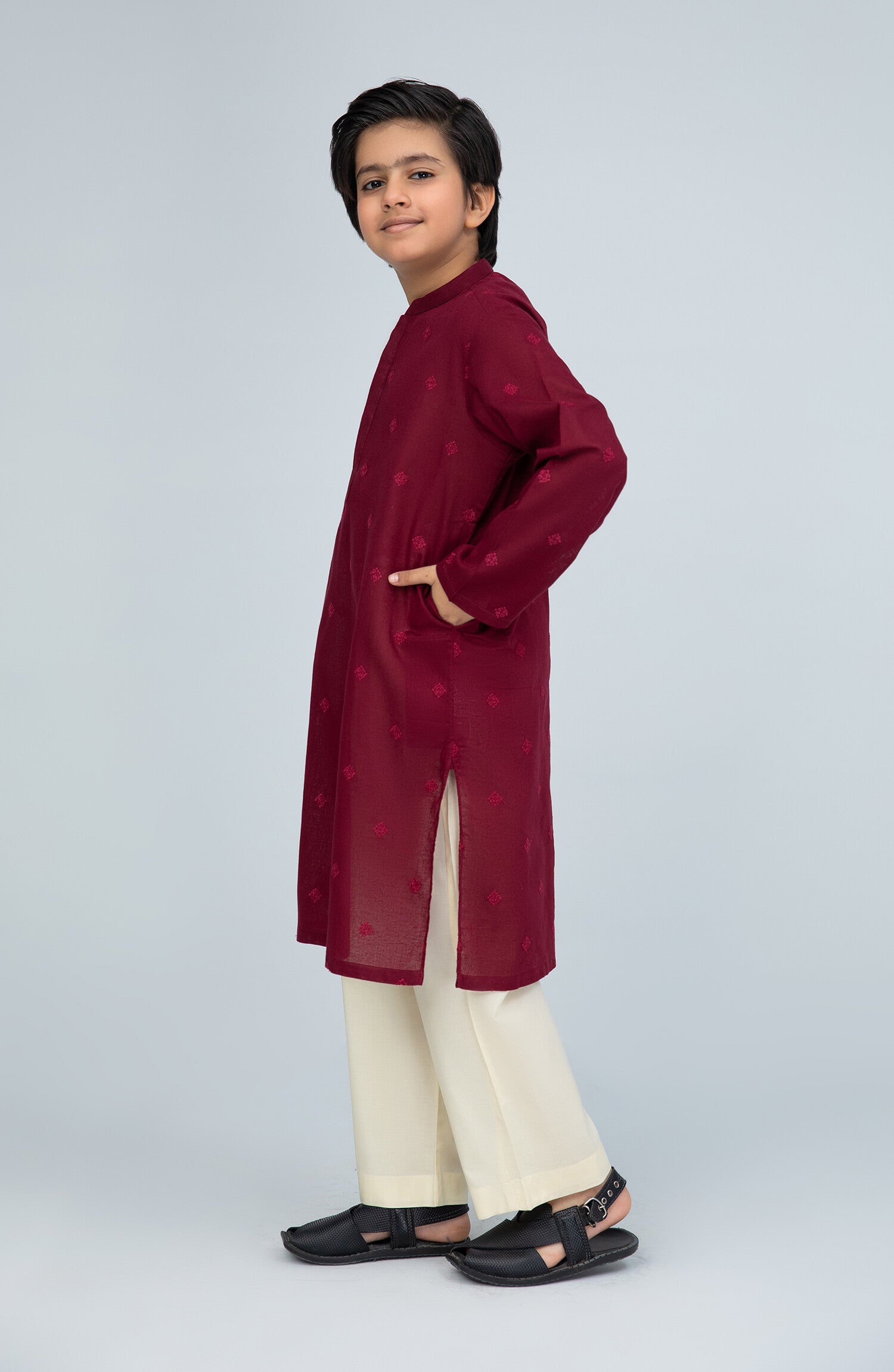 Boys Round Neck Schiffilli Kurta Streight Hem In Maroon