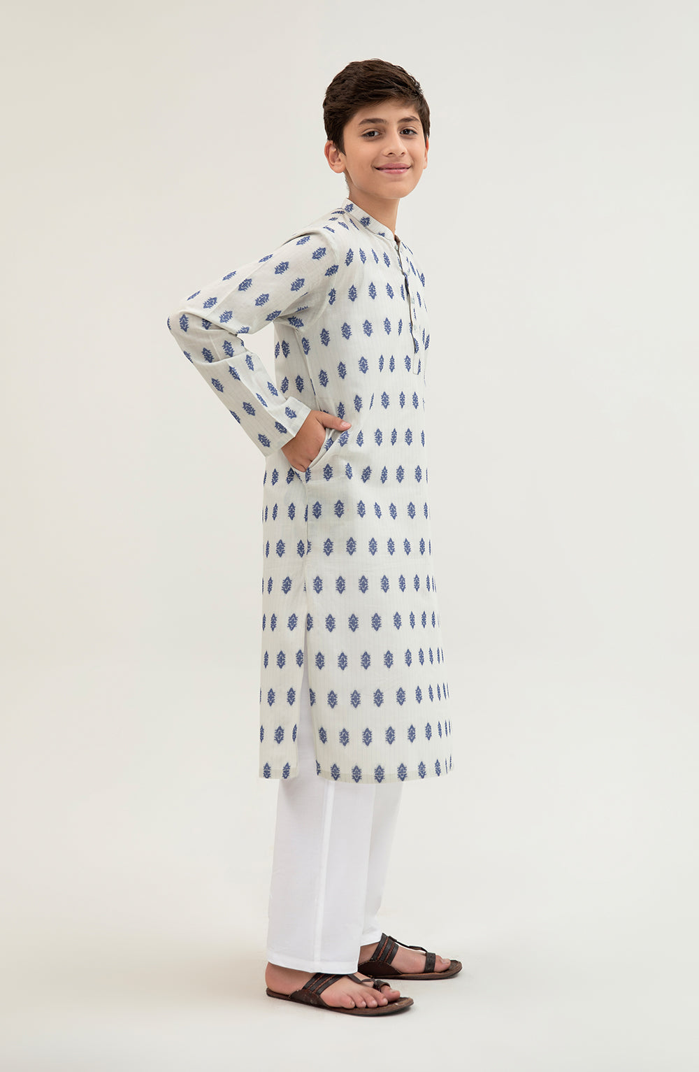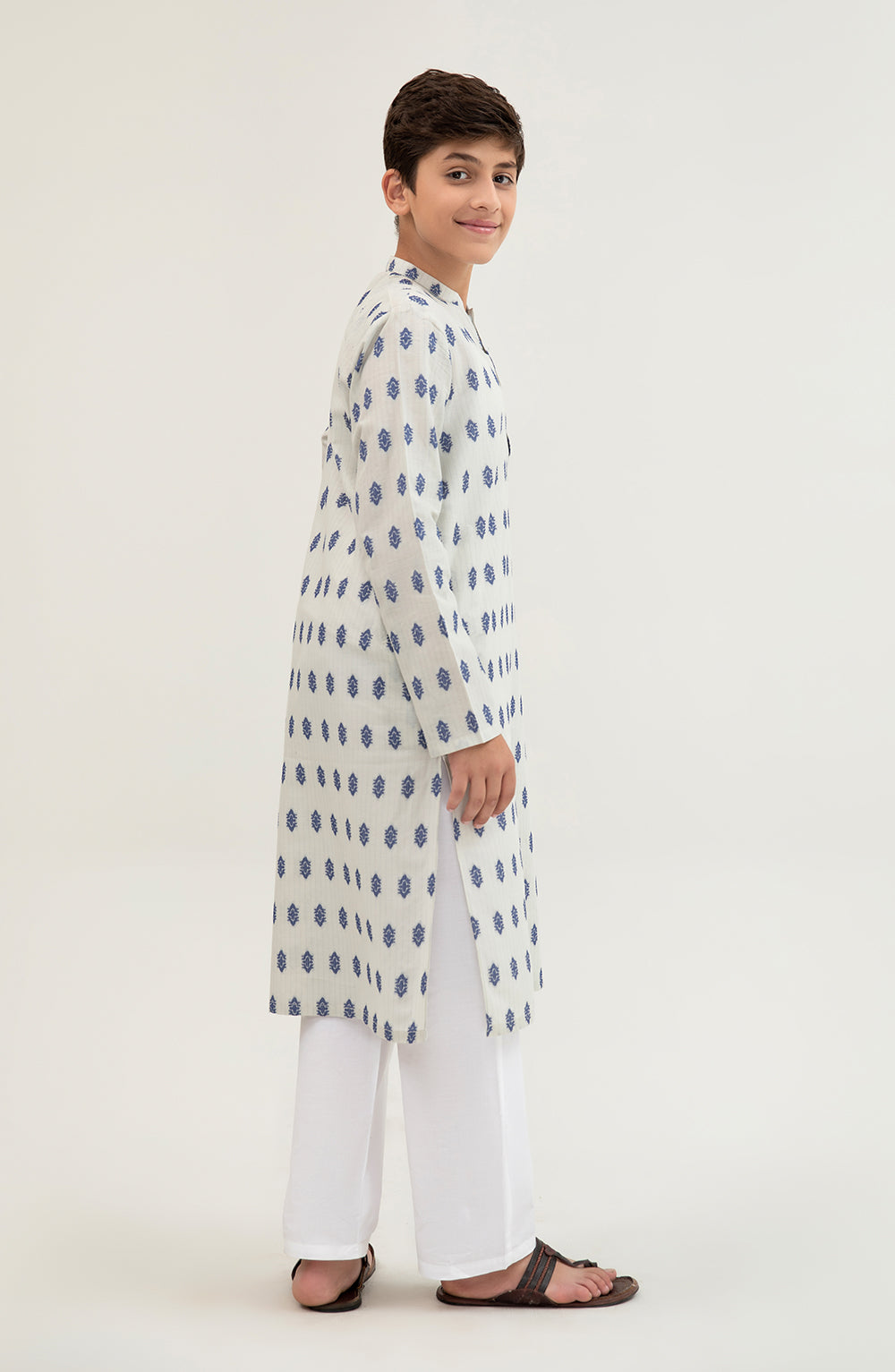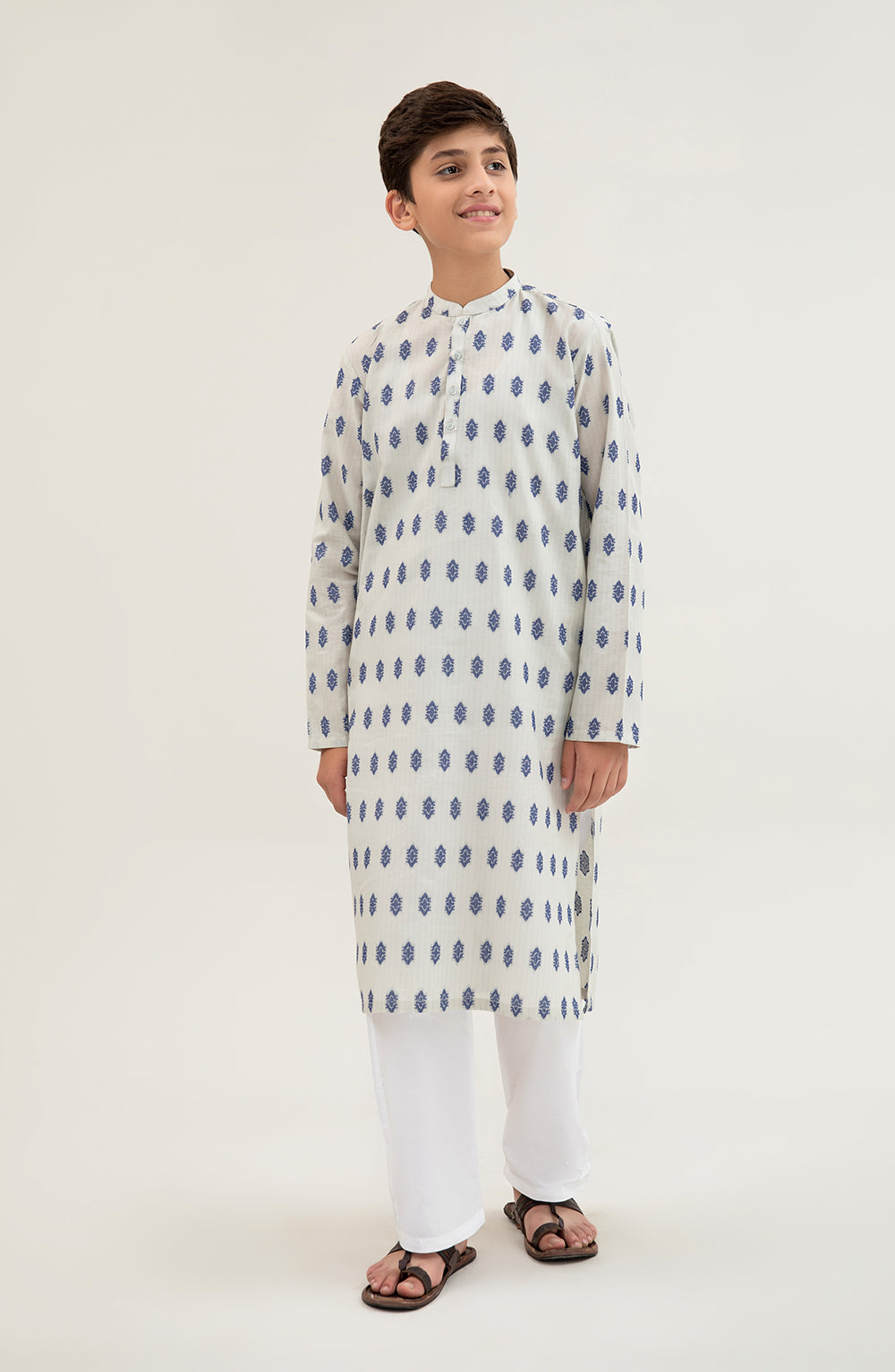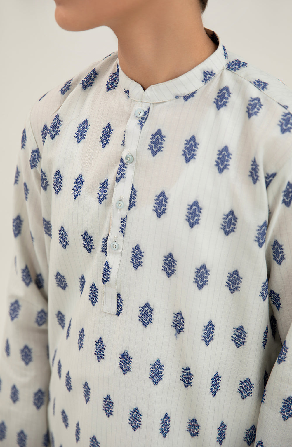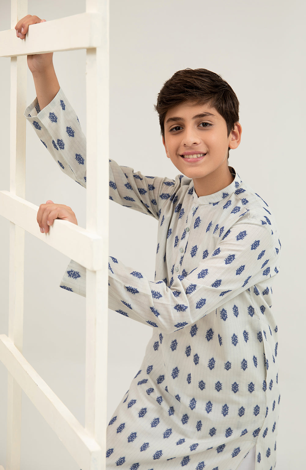This Grey Shahbaleh kurta, made from premium Jacquard fabric, offers a refined yet comfortable look for boys. The intricate texture and classic design make it an excellent choice for both casual and semi-formal occasions, combining elegance and ease in one.