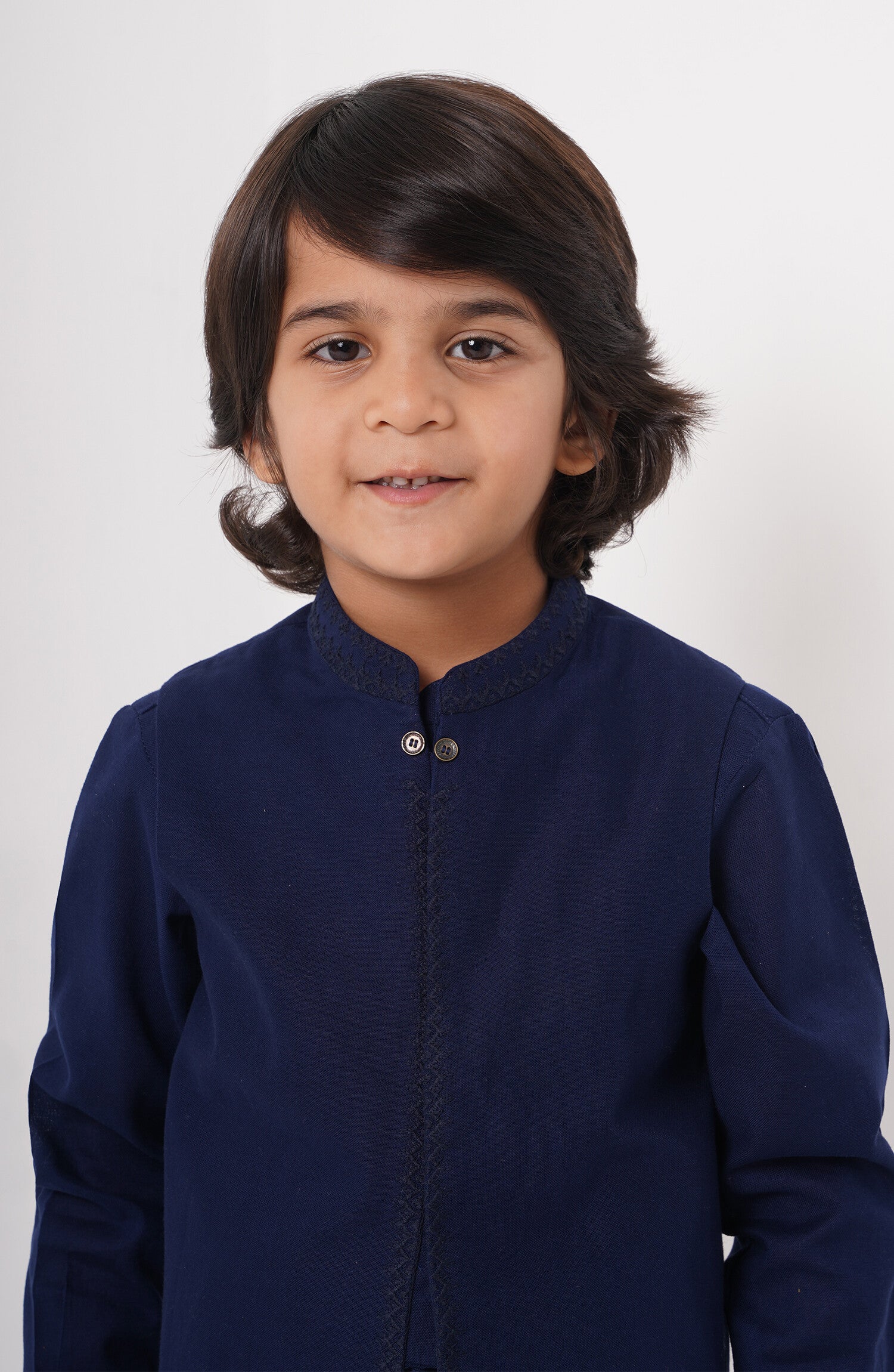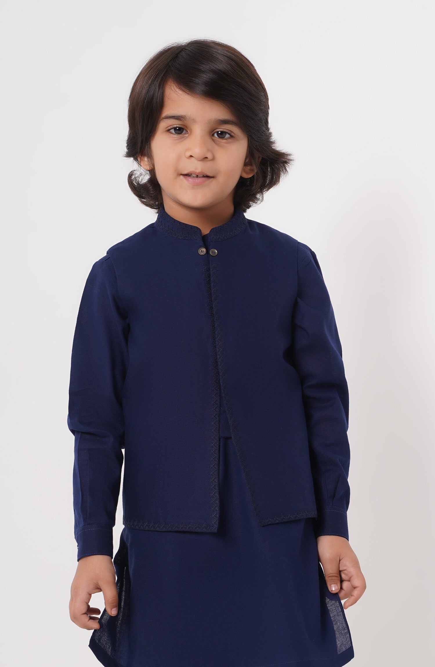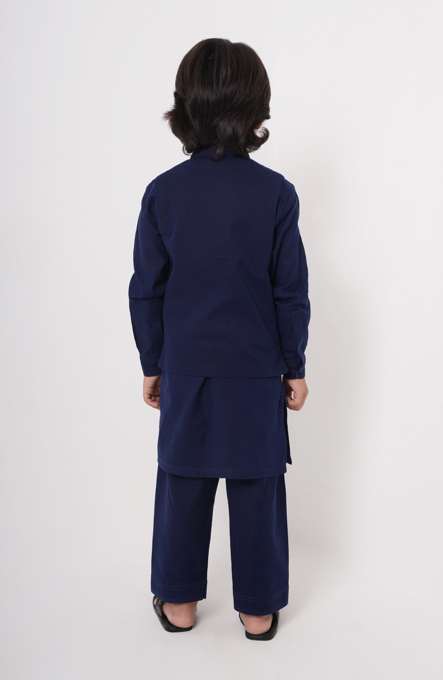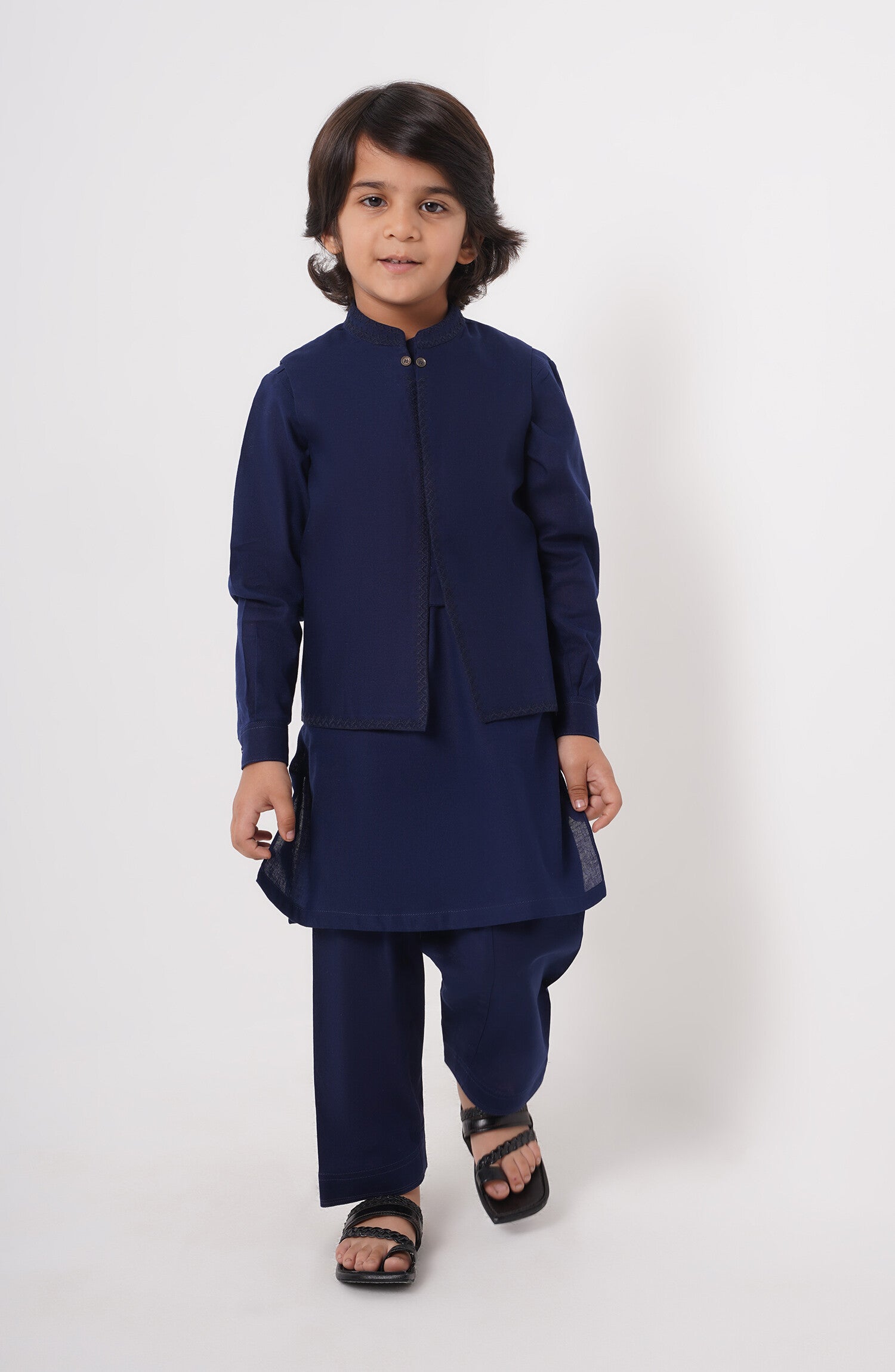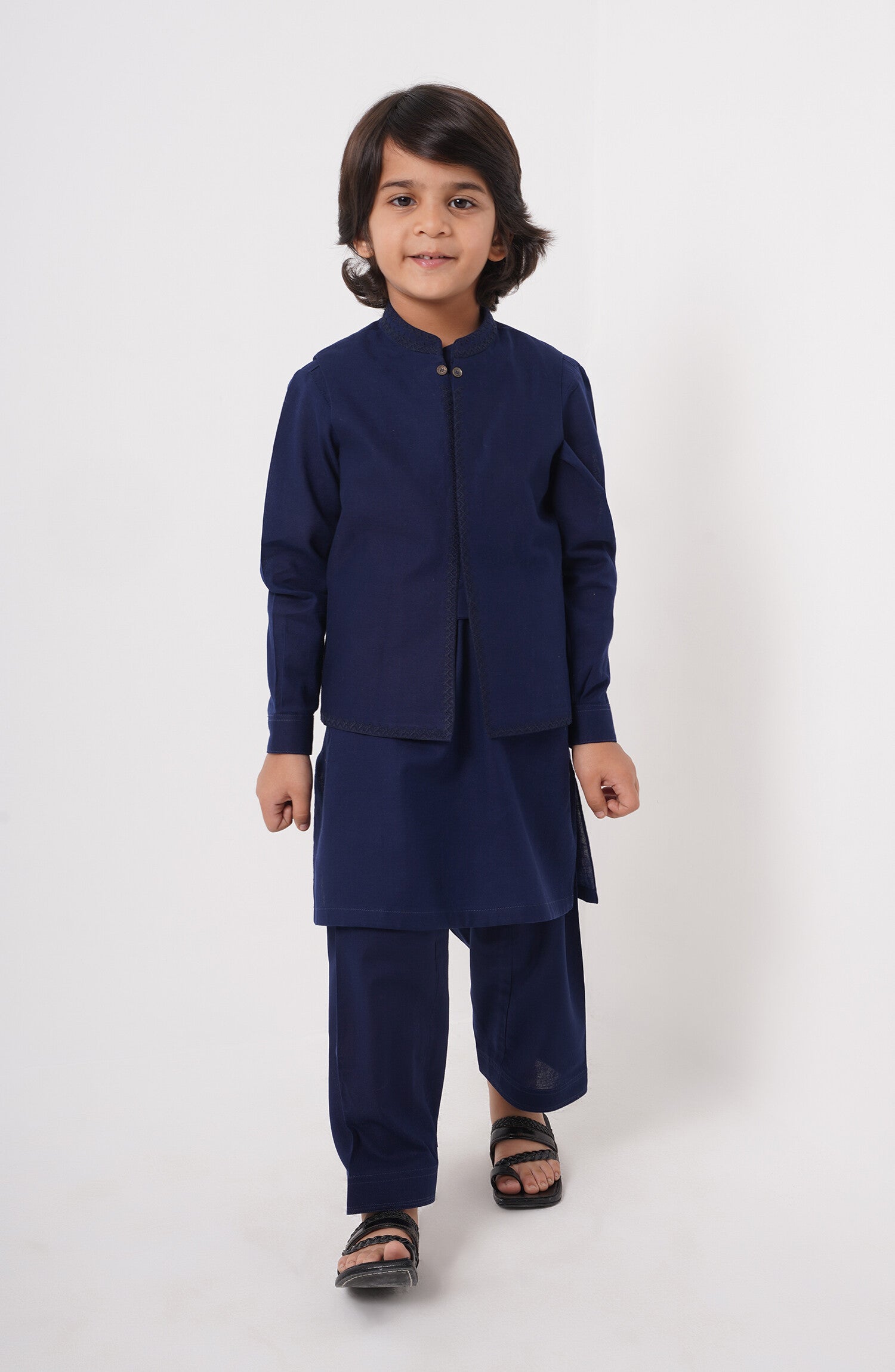 3Pc Infant Suit Slub Khaddar 21X21 Kurta,Shalwar Blue Embroidered Waistcoat