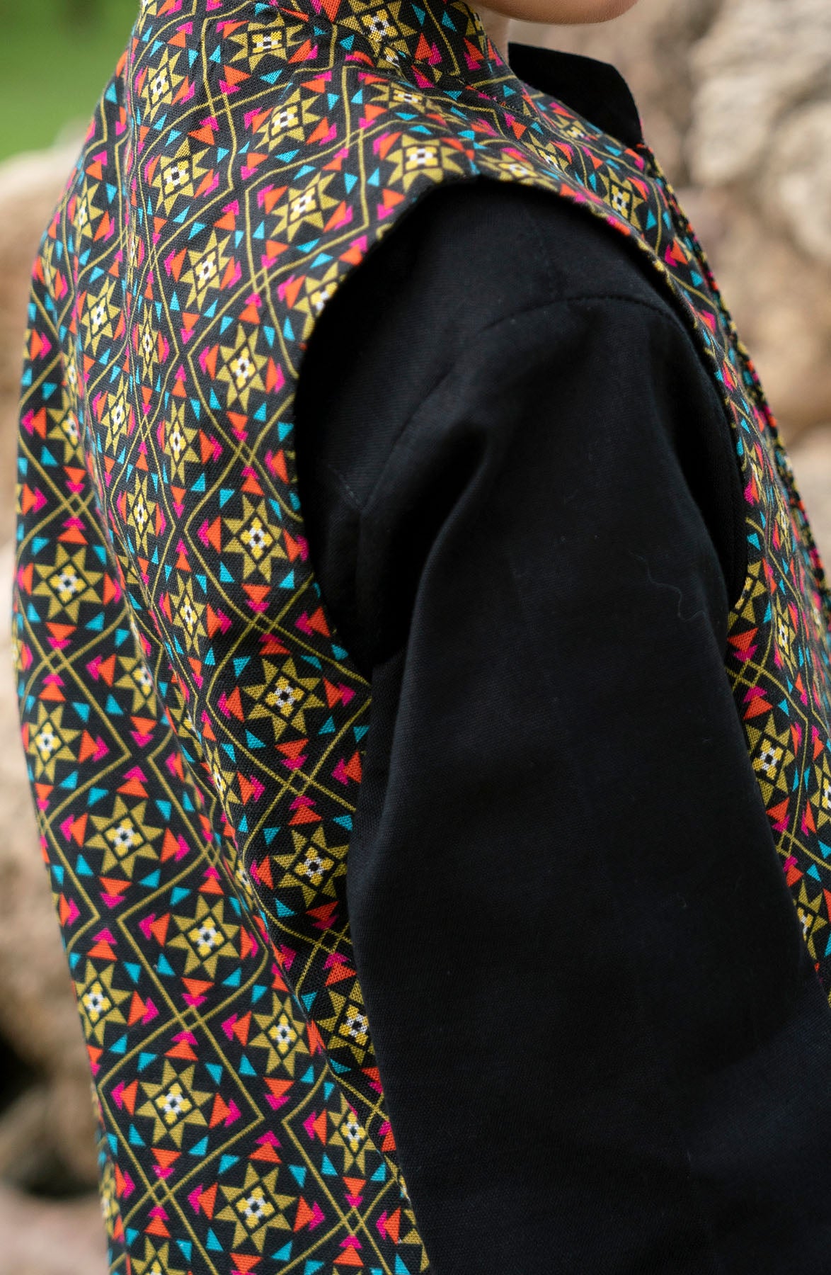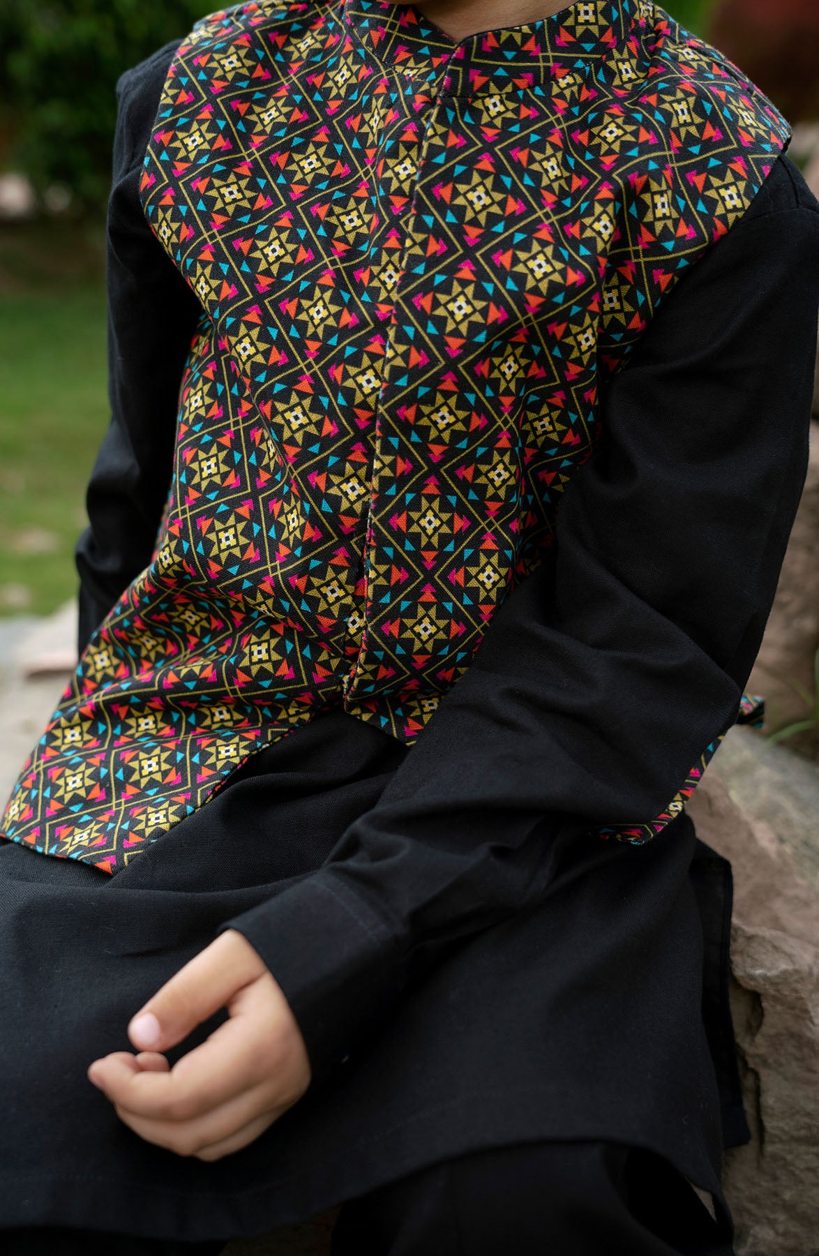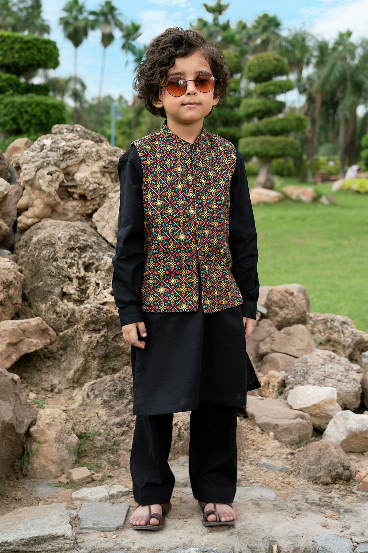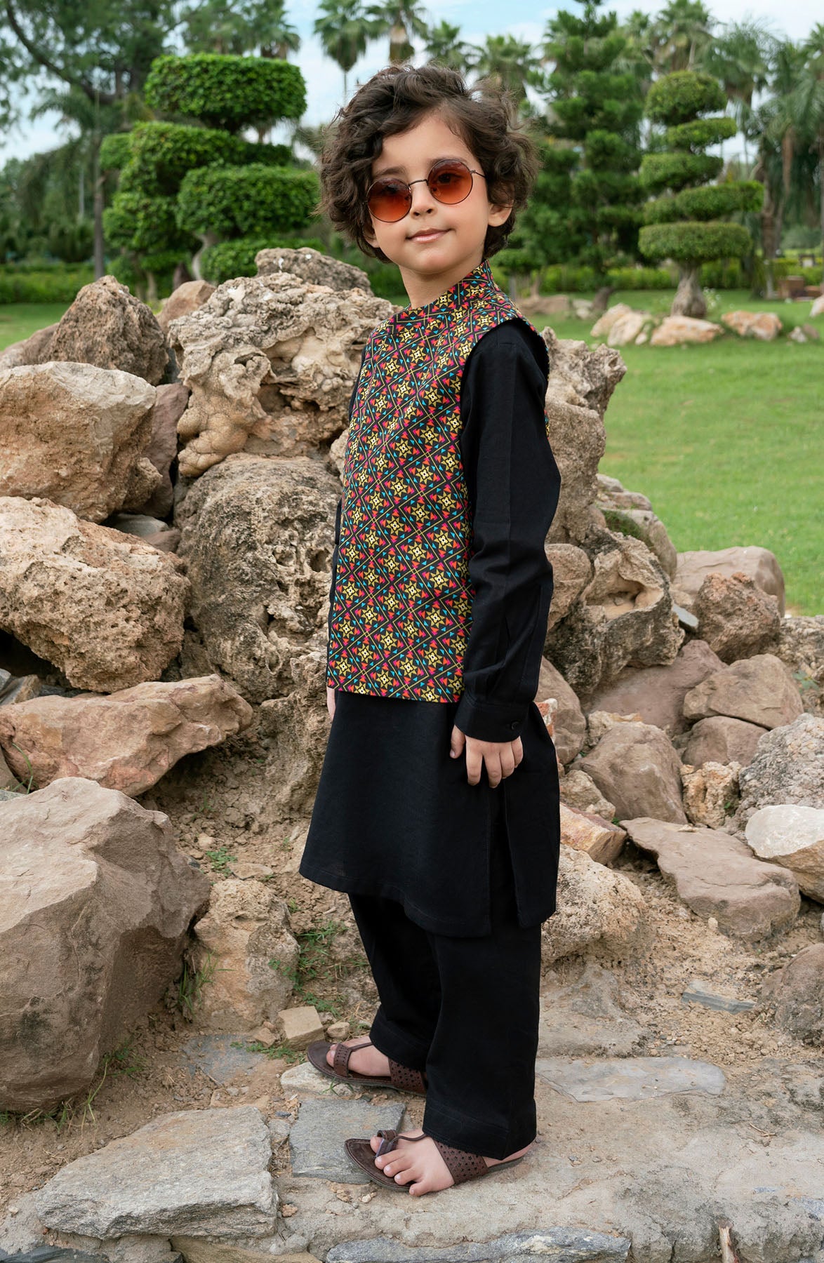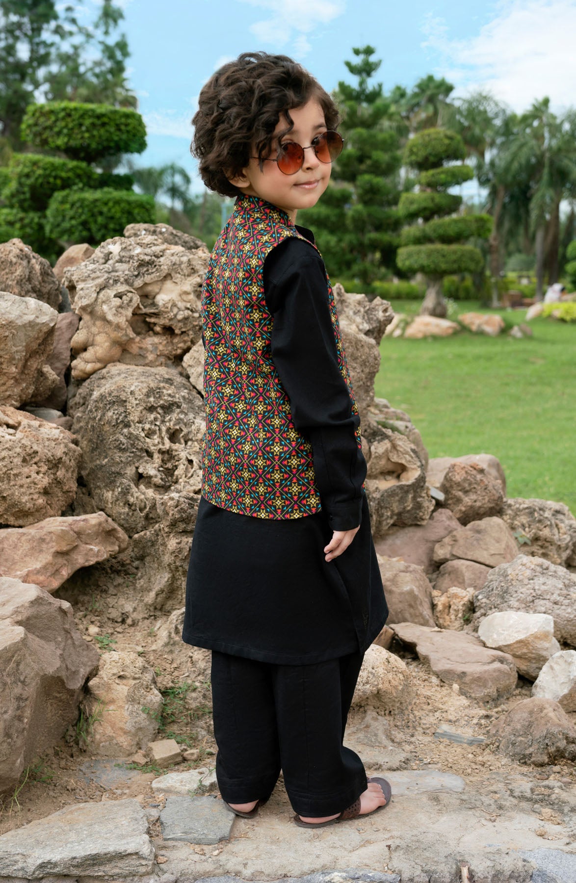 3Pcs Infant Suit Slub Khaddar 21X21 Kurta,Shalwar Black Printed Waistcoat